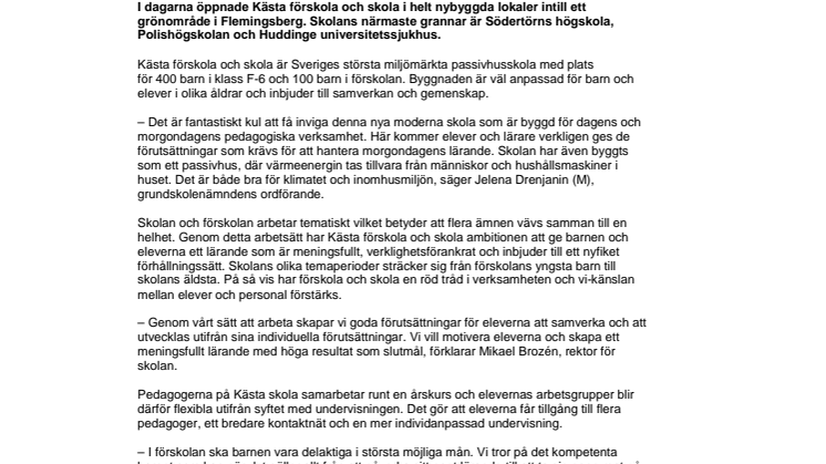 I dagarna öppnade Kästa förskola och skola i helt nybyggda lokaler intill ett grönområde i Flemingsberg. Skolans närmaste grannar är Södertörns högskola, Polishögskolan och Huddinge universitetssjukhus.
