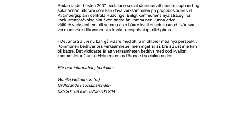 Redan under hösten 2007 beslutade socialnämnden att genom upphandling söka annan utförare som kan driva verksamheten på gruppbostaden vid Kvarnbergsplan i centrala Huddinge. Enligt kommunens nya strategi för konkurrensprövning ska även andra än kommunen kunna driva välfärdsverksamheter till samma eller bättre kvalitet och kostnad. När nya verksamheter tillkommer ska konkurrensprövning alltid göras.