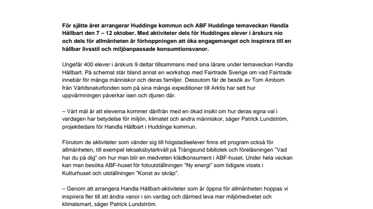 För sjätte året arrangerar Huddinge kommun och ABF Huddinge temaveckan Handla Hållbart den 7 – 12 oktober. Med aktiviteter dels för Huddinges elever i årskurs nio och dels för allmänheten är förhoppningen att öka engagemanget och inspirera till en hållbar livsstil och miljöanpassade konsumtionsvanor.