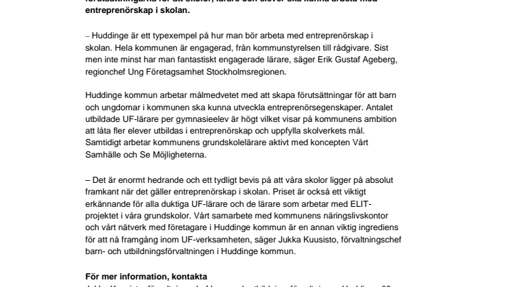 – Det är enormt hedrande och ett tydligt bevis på att våra skolor ligger i framkant när det gäller entreprenörskap i skolan. Priset är också ett viktigt erkännande för alla duktiga UF-lärare och de lärare som arbetar med ELIT-projektet i våra grundskolor. Vårt samarbete med kommunens näringslivskontor och vårt nätverk med företagare i Huddinge kommun är en annan viktig ingrediens för att nå framgång inom UF-verksamheten, säger Jukka Kuusisto, förvaltningschef barn- och utbildningsförvaltningen i Huddinge kommun.