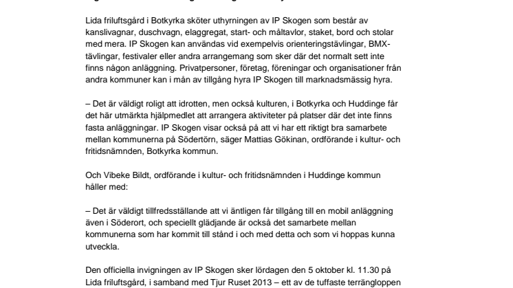 Den officiella invigningen av IP Skogen sker lördagen den 5 oktober kl. 11.30 på Lida friluftsgård, i samband med Tjur Ruset 2013 – ett av de tuffaste terrängloppen i landet.
