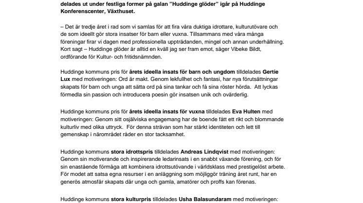 – Det är tredje året i rad som vi samlas för att fira våra duktiga idrottare, kulturutövare och de som ideellt gör stora insatser för barn eller vuxna. Tillsammans med våra många föreningar firar vi dagen med professionella uppträdanden, mingel och annan underhållning. Kort sagt – Huddinge glöder är alltid en kväll jag ser fram emot, säger Vibeke Bildt, ordförande för Kultur- och fritidsnämnden.