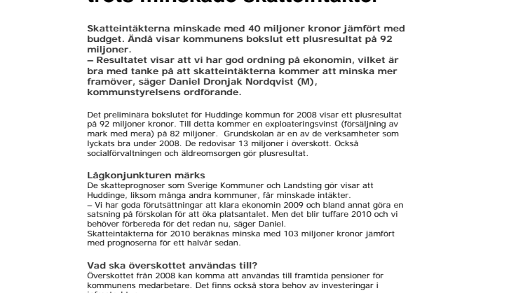 Det preliminära bokslutet för Huddinge kommun för 2008 visar ett plusresultat på 92 miljoner kronor. Till detta kommer en exploateringsvinst (försäljning av mark med mera) på 82 miljoner. Grundskolan är en av de verksamheter som lyckats bra under 2008. De redovisar 13 miljoner i överskott. Också socialförvaltningen och äldreomsorgen gör plusresultat. Lågkonjunkturen märks