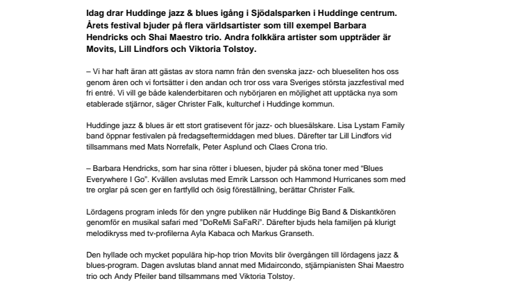 Idag drar Huddinge jazz & blues igång i Sjödalsparken i Huddinge centrum. Årets festival bjuder på flera världsartister som till exempel Barbara Hendricks och Shai Maestro trio. Andra folkkära artister som uppträder är Movits, Lill Lindfors och Viktoria Tolstoy.