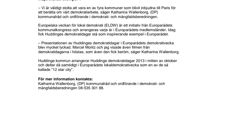 Huddinge kommun deltog idag på Europarådets ELDW-möte i Paris för att presentera arbetet med Huddinges demokratidagar 2012 som ”ett inspirerande exempel”.
