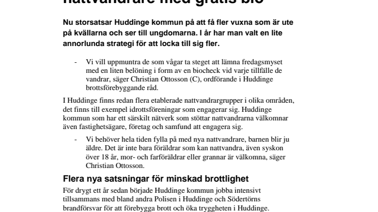 - Vi vill uppmuntra de som vågar ta steget att lämna fredagsmyset med en liten belöning i form av en biocheck vid varje tillfälle de vandrar, säger Christian Ottosson (C), ordförande i Huddinge brottsförebyggande råd.