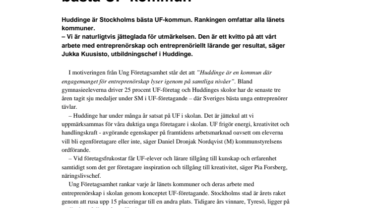 – Huddinge har under många år satsat på UF i skolan. Det är jättekul att vi uppmärksammas för våra duktiga unga företagare i skolan. UF frigör energi, kreativitet och handlingskraft - avgörande egenskaper på framtidens arbetsmarknad oavsett om eleverna vill bli egenföretagare eller inte, säger Daniel Dronjak Nordqvist (M) kommunstyrelsens ordförande.