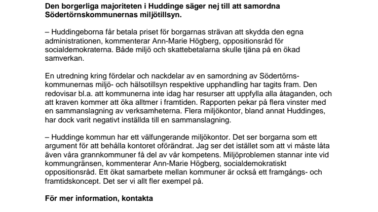 Den borgerliga majoriteten i Huddinge säger nej till att samordna Södertörnskommunernas miljötillsyn.