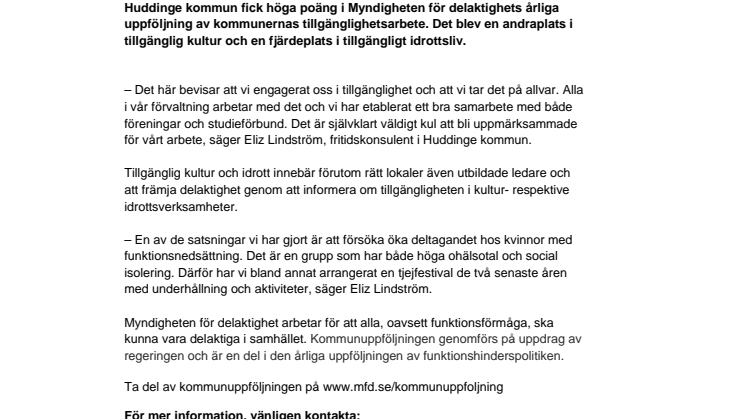 Huddinge kommun fick höga poäng i Myndigheten för delaktighets årliga uppföljning av kommunernas tillgänglighetsarbete. Det blev en andraplats i tillgänglig kultur och en fjärdeplats i tillgängligt idrottsliv.