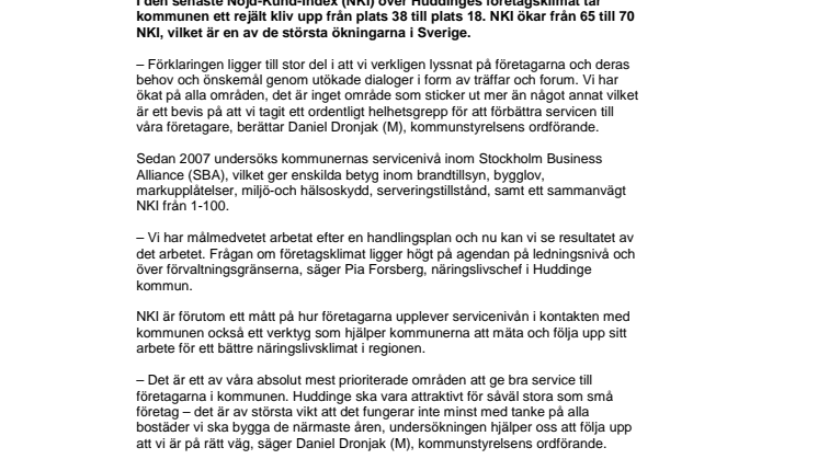I den senaste Nöjd-Kund-Index (NKI) över Huddinges företagsklimat tar kommunen ett rejält kliv upp från plats 38 till plats 18. NKI ökar från 65 till 70 NKI, vilket är en av de största ökningarna i Sverige.