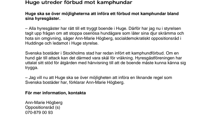 Svenska bostäder i Stockholms stad har redan infört ett kamphundförbud. Om en hund går till attack kan det därmed vara skäl för vräkning. Hyresgästföreningen har uttalat sitt stöd för åtgärden med hänvisning till att de boende måste kunna känna sig trygga.