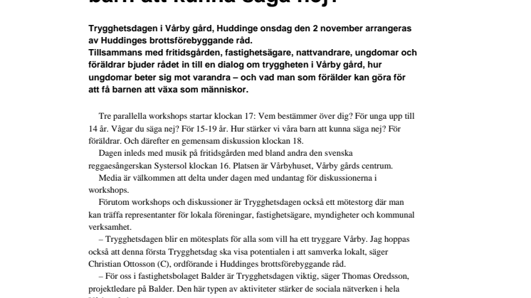 Tre parallella workshops startar klockan 17: Vem bestämmer över dig? För unga upp till 14 år. Vågar du säga nej? För 15-19 år. Hur stärker vi våra barn att kunna säga nej? För föräldrar. Och därefter en gemensam diskussion klockan 18.