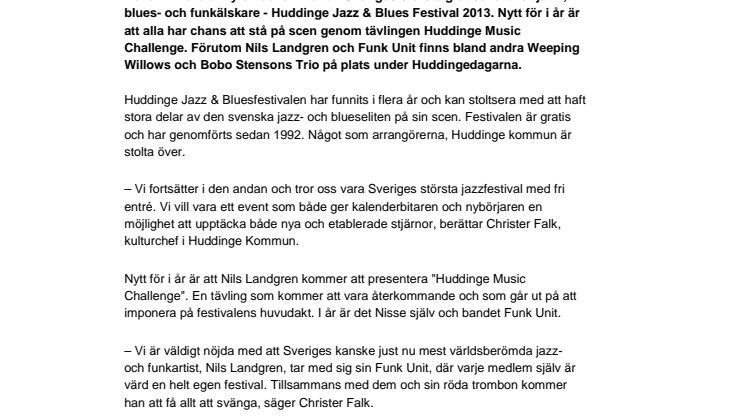 Det är mindre än fyra veckor kvar till Sveriges största gratisevent för jazz-, blues- och funkälskare - Huddinge Jazz & Blues Festival 2013. Nytt för i år är att alla har chans att stå på scen genom tävlingen Huddinge Music Challenge. Förutom Nils Landgren och Funk Unit finns bland andra Weeping Willows och Bobo Stensons Trio på plats under Huddingedagarna.