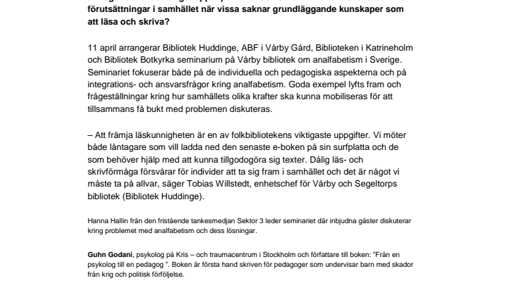 11 april arrangerar Bibliotek Huddinge, ABF i Vårby Gård, Biblioteken i Katrineholm och Bibliotek Botkyrka seminarium på Vårby bibliotek om analfabetism i Sverige. Seminariet fokuserar både på de individuella och pedagogiska aspekterna och på integrations- och ansvarsfrågor kring analfabetism. Goda exempel lyfts fram och frågeställningar kring hur samhällets olika krafter ska kunna mobiliseras för att tillsammans få bukt med problemen diskuteras.