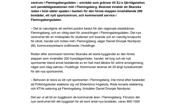 År av diskussioner och förhandlingar är till ända. Kommunstyrelsen har nu beslutat att godkänna ett avtal med Skanska om utvecklingen av ett nytt centrum i Flemingsbergsdalen – området som gränsar till SJ:s fjärrtågstation och pendeltågsstationen mitt i Flemingsberg. Beslutet innebär att Skanska redan i höst sätter spaden i backen för den första etappen innehållande 200 bostäder, ett nytt sportcentrum, och kommersiell service i Flemingsbergsdalen.