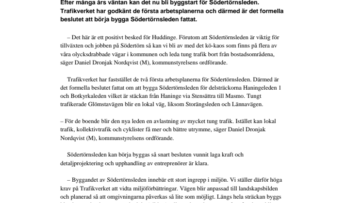 – Det här är ett positivt besked för Huddinge. Förutom att Södertörnsleden är viktig för tillväxten och jobben på Södertörn så kan vi bli av med det kö-kaos som finns på flera av våra olycksdrabbade vägar i kommunen och leda tung trafik bort från bostadsområdena, säger Daniel Dronjak Nordqvist (M), kommunstyrelsens ordförande.
