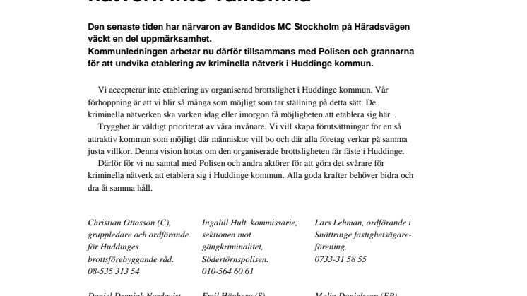 Vi accepterar inte etablering av organiserad brottslighet i Huddinge kommun. Vår förhoppning är att vi blir så många som möjligt som tar ställning på detta sätt. De kriminella nätverken ska varken idag eller imorgon få möjligheten att etablera sig här.