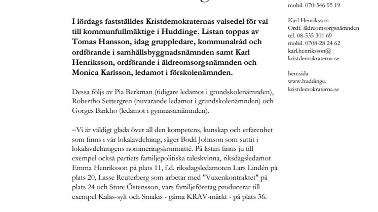 I lördags fastställdes Kristdemokraternas valsedel för val till kommunfullmäktige i Huddinge. Listan toppas av Tomas Hansson, idag gruppledare, kommunalråd och ordförande i samhällsbyggnadsnämnden samt Karl Henriksson, ordförande i äldreomsorgsnämnden och Monica Karlsson, ledamot i förskolenämnden.