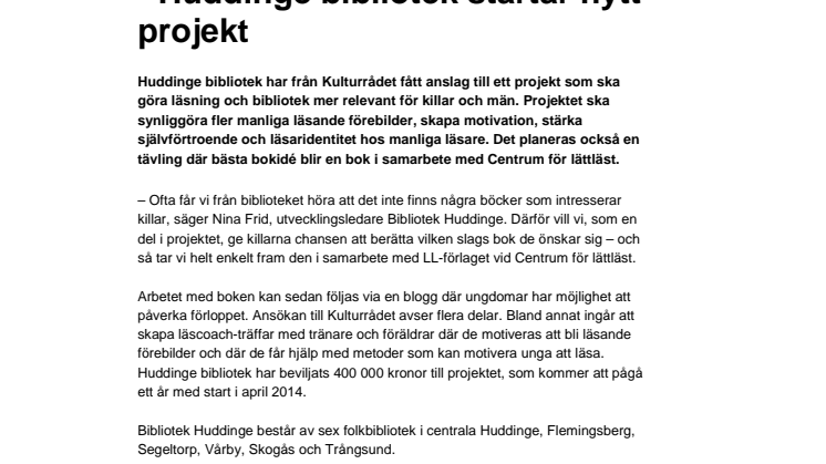 Huddinge bibliotek har från Kulturrådet fått anslag till ett projekt som ska göra läsning och bibliotek mer relevant för killar och män. Projektet ska synliggöra fler manliga läsande förebilder, skapa motivation, stärka självförtroende och läsaridentitet hos manliga läsare. Det planeras också en tävling där bästa bokidé blir en bok i samarbete med Centrum för lättläst.