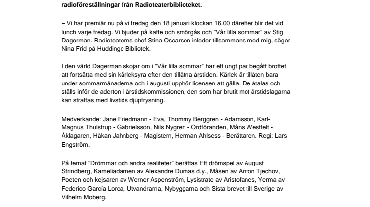 – Vi har premiär nu på vi fredag den 18 januari klockan 16.00 därefter blir det vid lunch varje fredag. Vi bjuder på kaffe och smörgås och ”Vår lilla sommar” av Stig Dagerman. Radioteaterns chef Stina Oscarson inleder tillsammans med mig, säger Nina Frid på Huddinge Bibliotek.