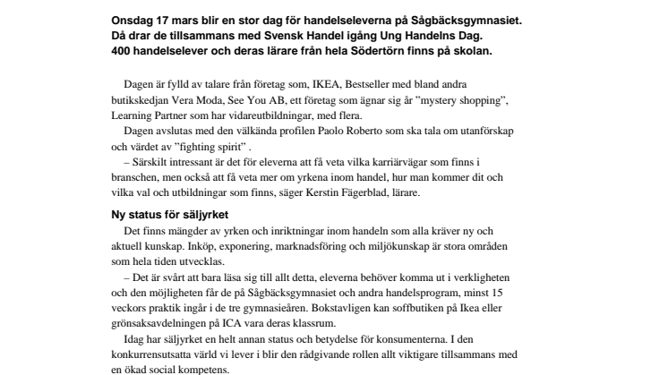 Onsdag 17 mars blir en stor dag för handelseleverna på Sågbäcksgymnasiet. Då drar de tillsammans med Svensk Handel igång Ung Handelns Dag.