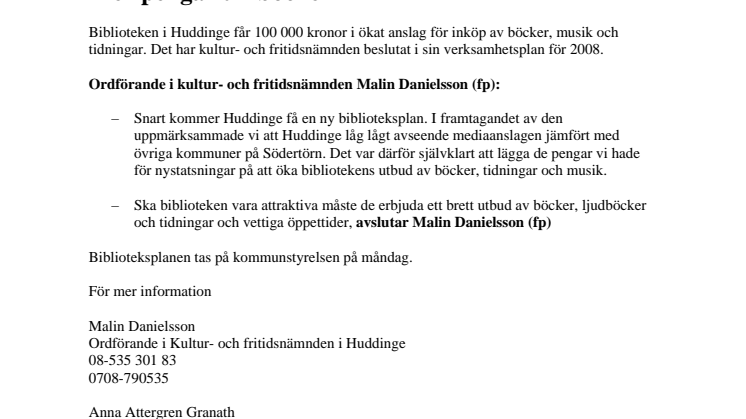 Biblioteken i Huddinge får 100 000 kronor i ökat anslag för inköp av böcker, musik och tidningar. Det har kultur- och fritidsnämnden beslutat i sin verksamhetsplan för 2008.