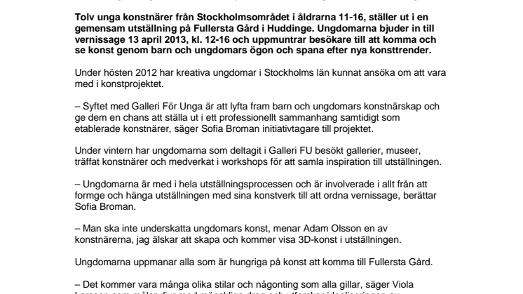 Tolv unga konstnärer från Stockholmsområdet i åldrarna 11-16, ställer ut i en gemensam utställning på Fullersta Gård i Huddinge. Ungdomarna bjuder in till vernissage 13 april 2013, kl. 12-16 och uppmuntrar besökare till att komma och se konst genom barn och ungdomars ögon och spana efter nya konsttrender.