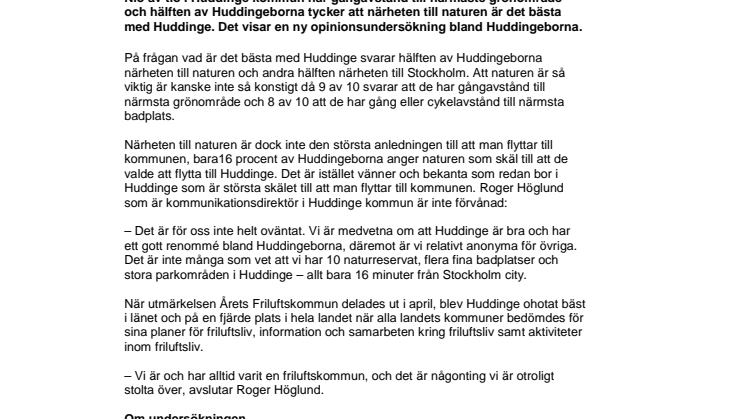 Närheten till naturen är dock inte den största anledningen till att man flyttar till kommunen, bara 16 procent av Huddingeborna anger naturen som skäl till att de valde att flytta till Huddinge. Det är istället vänner och bekanta som redan bor i Huddinge som är största skälet till att man flyttar till kommunen. Roger Höglund som är kommunikationsdirektör i Huddinge kommun är inte förvånad: