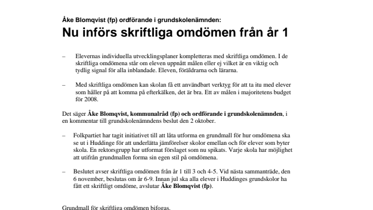 - Beslutet avser skriftliga omdömen från år 1 till 5. Vid nästa sammanträde, den 6 november, beslutas om år 6-9. Innan jul ska alla elever i Huddinges grundskolor ha fått ett skriftligt omdöme, avslutar Åke Blomqvist (fp).