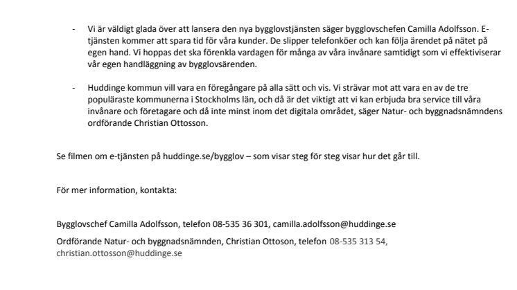 - Vi är väldigt glada över att lansera den nya bygglovstjänsten säger bygglovschefen Camilla Adolfsson. E-tjänsten kommer att spara tid för våra kunder. De slipper telefonköer och kan följa ärendet på nätet på egen hand. Vi hoppas det ska förenkla vardagen för många av våra invånare samtidigt som vi effektiviserar vår egen handläggning av bygglovsärenden.