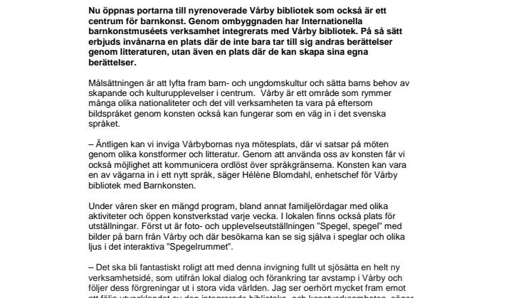 Nu öppnas portarna till nyrenoverade Vårby bibliotek som också är ett centrum för barnkonst. Genom ombyggnaden har Internationella barnkonstmuséets verksamhet integrerats med Vårby bibliotek. På så sätt erbjuds invånarna en plats där de inte bara tar till sig andras berättelser genom litteraturen, utan även en plats där de kan skapa sina egna berättelser.