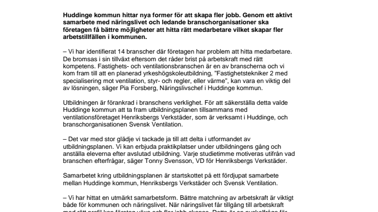 Samarbetet kring utbildningsplanen är startskottet på ett fördjupat samarbete mellan Huddinge kommun, Henriksbergs Verkstäder och Svensk Ventilation.