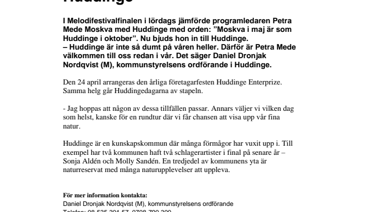I Melodifestivalfinalen i lördags jämförde programledaren Petra Mede Moskva med Huddinge med orden: "Moskva i maj är som Huddinge i oktober". Nu bjuds hon in till Huddinge.