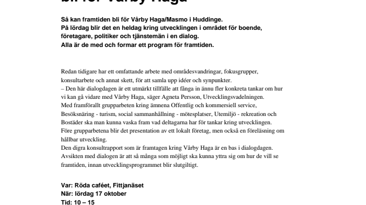 - Den här dialogdagen är ett utmärkt tillfälle att fånga in ännu fler konkreta tankar om hur vi kan gå vidare med Vårby Haga, säger Agneta Persson, Utvecklingsvadelningen.