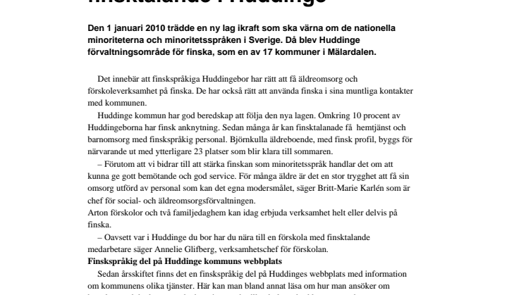 Det innebär att finskspråkiga Huddingebor har rätt att få äldreomsorg och förskoleverksamhet på finska. De har också rätt att använda finska i sina muntliga kontakter med kommunen.