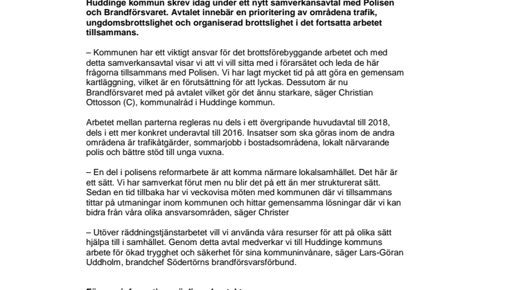 – Kommunen har ett viktigt ansvar för det brottsförebyggande arbetet och med detta samverkansavtal visar vi att vi vill sitta med i förarsätet och leda de här frågorna tillsammans med Polisen. Vi har lagt mycket tid på att göra en gemensam kartläggning, vilket är en förutsättning för att lyckas. Dessutom är nu Brandförsvaret med på avtalet vilket gör det ännu starkare, säger Christian Ottosson (C), kommunalråd i Huddinge kommun.
