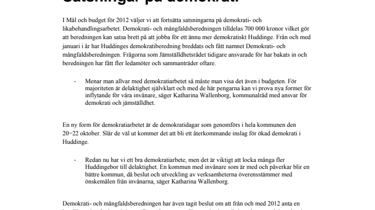 att beredningen kan satsa brett på att jobba för ett ännu mer demokratiskt Huddinge. Från och med
