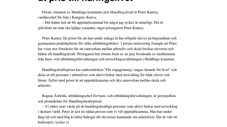 Peter Kantzy får priset för att han under många år har erbjudit elever på högstadium och gymnasium praktikplatser för olika utbildningsbehov. I juryns motivering framgår att Peter har visat stor förståelse för att samverkan mellan arbetsliv och skola berikar eleverna och bidrar till handlingskraft. Pristagaren har röstats fram av en jury bestående av medlemmar från barn- och utbildningsförvaltningen och utvecklingsavdelningen i Huddinge kommun.