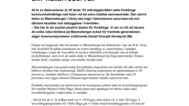 40 år av diskussioner är till ända. På måndagskvällen satte Huddinge kommunfullmäktige ned foten vid ett extra inkallat sammanträde. Den större delen av Masmoberget i Vårby ska ingå i Gömmarens naturreservat och därmed skyddas mot bebyggelse i framtiden.
