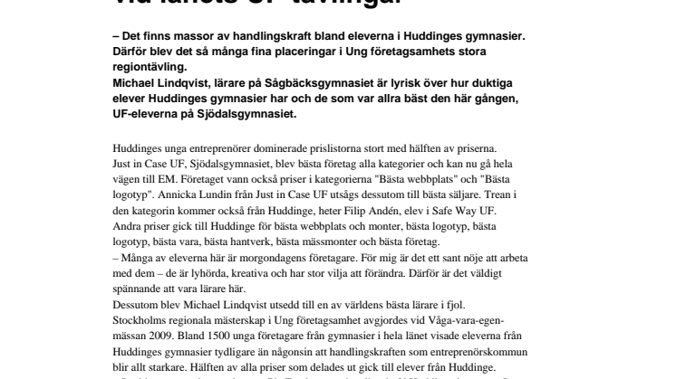 Just in Case UF, Sjödalsgymnasiet, blev bästa företag alla kategorier och kan nu gå hela vägen till EM. Företaget vann också priser i kategorierna "Bästa webbplats" och "Bästa logotyp". Annicka Lundin från Just in Case UF utsågs dessutom till bästa säljare. Trean i den kategorin kommer också från Huddinge, heter Filip Andén, elev i Safe Way UF.