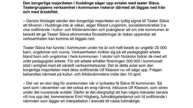 – Genom förslaget sänder den borgerliga majoriteten en tydlig signal till Teater Sláva att tillvaron i Huddinge inte är säker, säger Rikard Lingström, socialdemokratisk 2:e vice ordförande i kultur- och fritidsnämnden och poängterar att om inte kommunen är beredd att ge Teater Sláva ekonomiska förutsättningar är risken uppenbar att verksamheten kan komma att läggas ned.