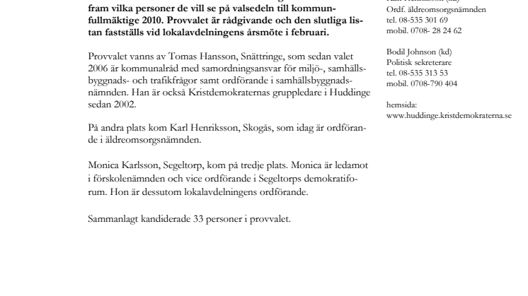 Kristdemokraternas medlemmar i Huddinge har nu röstat fram vilka personer de vill se på valsedeln till kommunfullmäktige 2010. Provvalet är rådgivande och den slutliga listan fastställs vid lokalavdelningens årsmöte i februari.