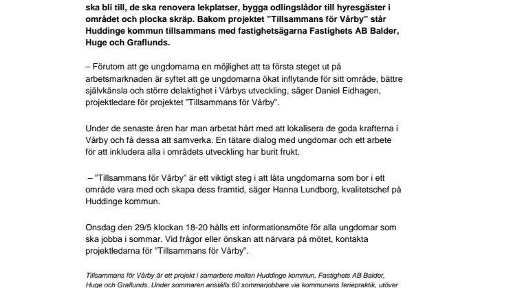 Tillsammans för Vårby är ett projekt i samarbete mellan Huddinge kommun, Fastighets AB Balder, Huge och Graflunds. Under sommaren anställs 60 sommarjobbare via kommunens feriepraktik, utöver dessa anställs 10 gruppledare som kommer att utbildas och leda varsin arbetsgrupp under sommaren. Tillsammans för Vårby pågår i nio veckor med start 17 juni. Syfte med projektet är att skapa en väg för ungdomar ut på arbetsmarknaden samt att de får ett ökat ägandeskap för sitt område, bättre självkänsla och större delaktighet i Vårbys utveckling.