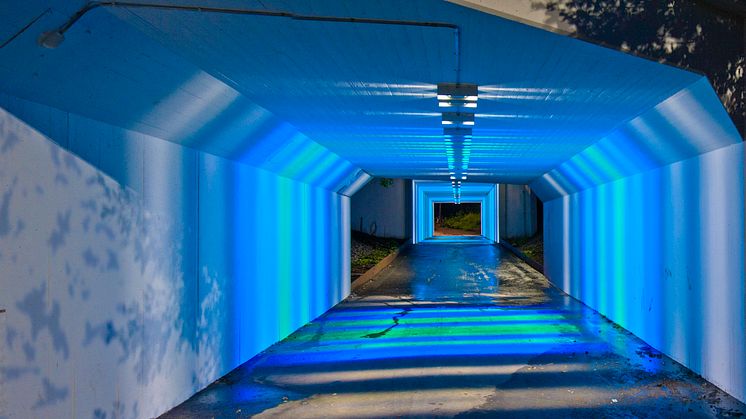 Idéerna gav resultat. Ett blått zebramönster länkar numera samman Nytorps mosse och Skogås så att tunnlarna däremellan upplevs som en del i ett längre gångstråk istället för en instängd plats som man ”går ner i”.