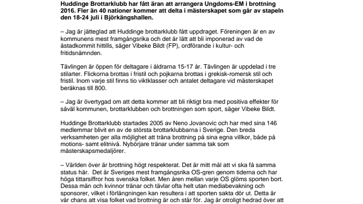 Huddinge Brottarklubb har fått äran att arrangera Ungdoms-EM i brottning 2016. Fler än 40 nationer kommer att delta i mästerskapet som går av stapeln den 18-24 juli i Björkängshallen.