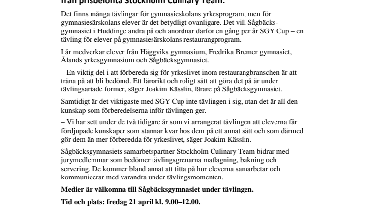 Den 21 april anordnar Sågbäcksgymnasiet i Huddinge för tredje året i rad SGY Cup. Tävlar gör elever på gymnasiesärskolans restaurangprogram och juryn består av professionella domare från prisbelönta Stockholm Culinary Team.