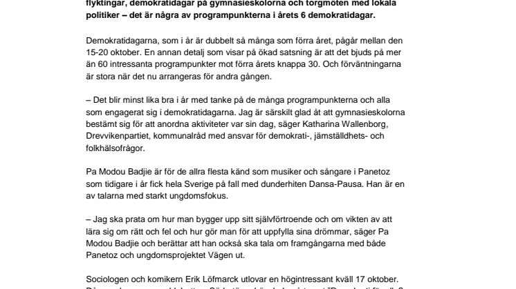 – Det blir minst lika bra i år med tanke på de många programpunkterna och alla som engagerat sig i demokratidagarna. Jag är särskilt glad åt att gymnasieskolorna