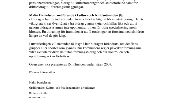 I utvärderingen vill nämnden få insyn i hur bidragen förändrats, om det finns grupper eller sporter som gynnas, hur kommunens regler påverkar föreningarna, vilka aktiviteter drivs helt utan föreningsbidrag och hur kontrollen och uppföljningen kan förbättras.