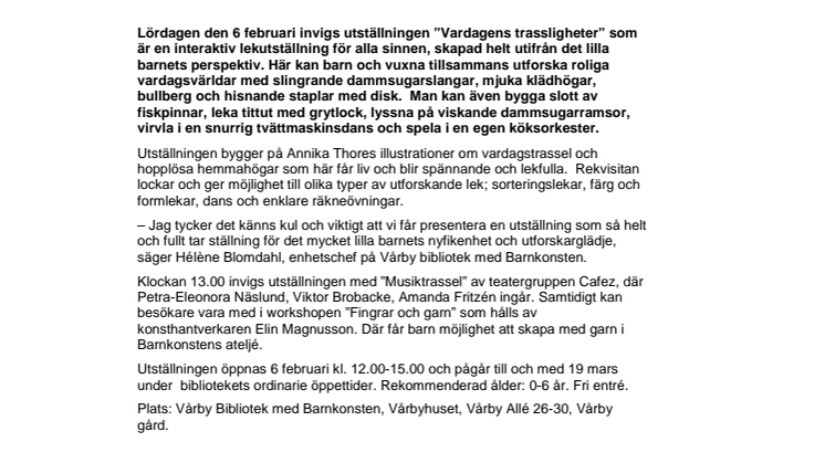 Lördagen den 6 februari invigs utställningen ”Vardagens trassligheter” som är en interaktiv lekutställning för alla sinnen, skapad helt utifrån det lilla barnets perspektiv. Här kan barn och vuxna tillsammans utforska roliga vardagsvärldar med slingrande dammsugarslangar, mjuka klädhögar, bullberg och hisnande staplar med disk. Man kan även bygga slott av fiskpinnar, leka tittut med grytlock, lyssna på viskande dammsugarramsor, virvla i en snurrig tvättmaskinsdans och spela i en egen köksorkester.