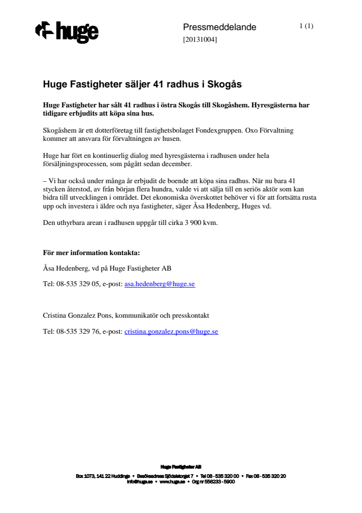 Huge Fastigheter har sålt 41 radhus i östra Skogås till Skogåshem. Hyresgästerna har tidigare erbjudits att köpa sina hus.